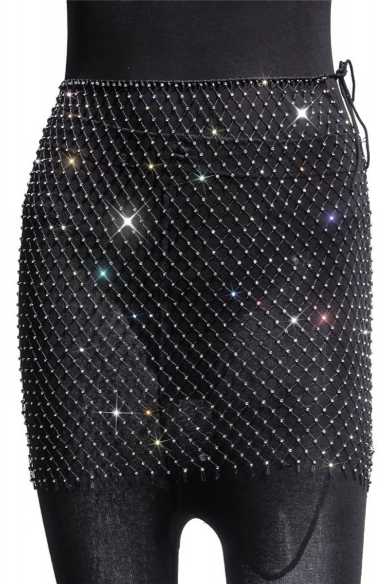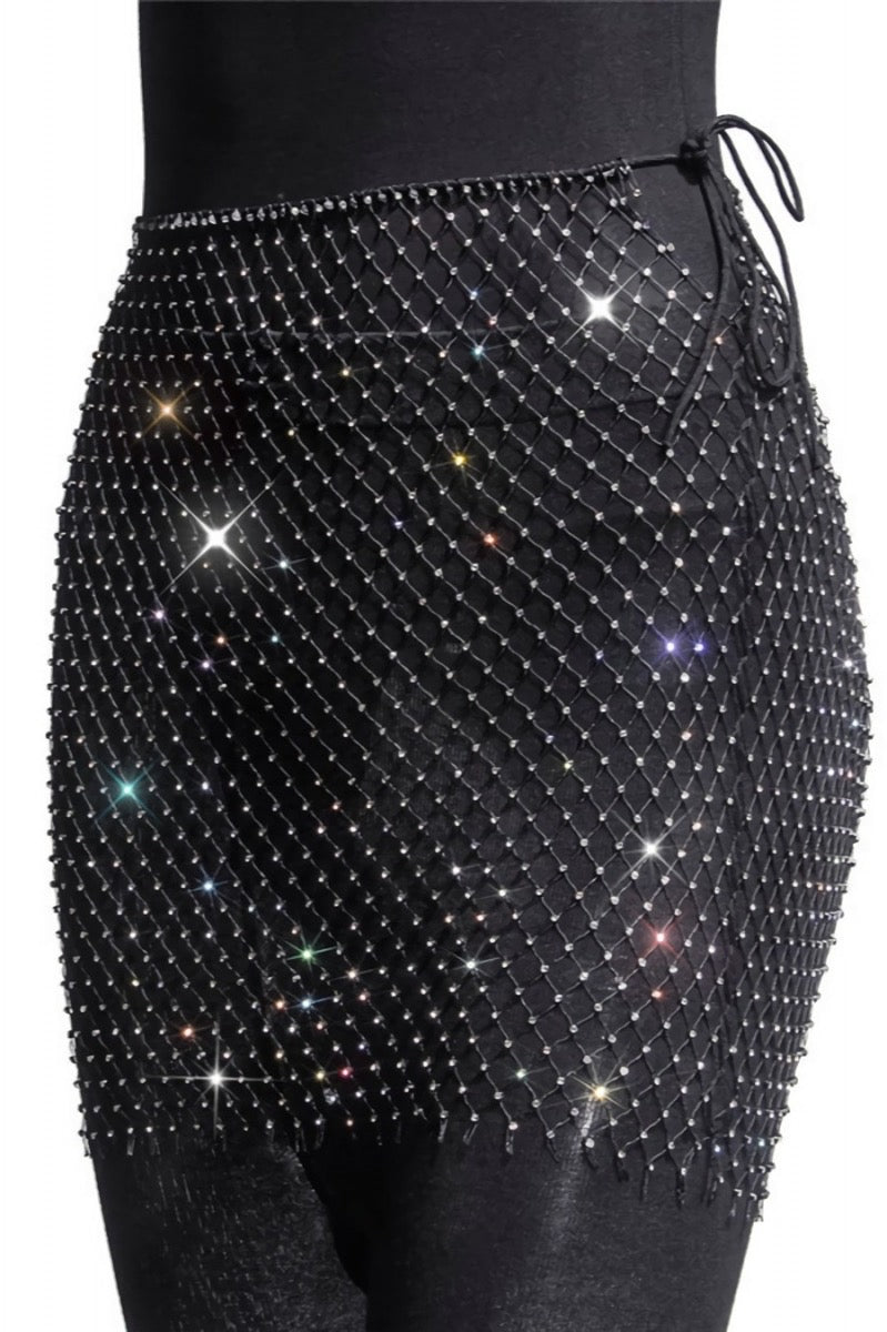 Summer new stylish fishnet see-through slight stretch rhinestone lace-up sexy skirt(unlined)
