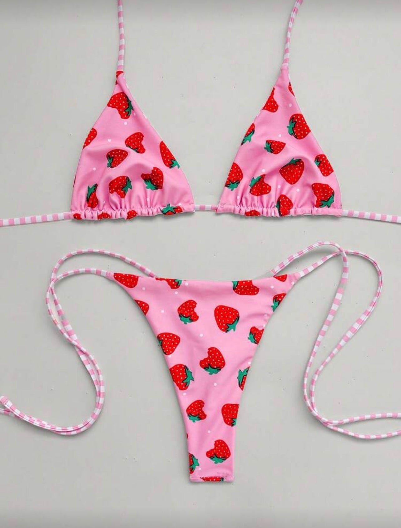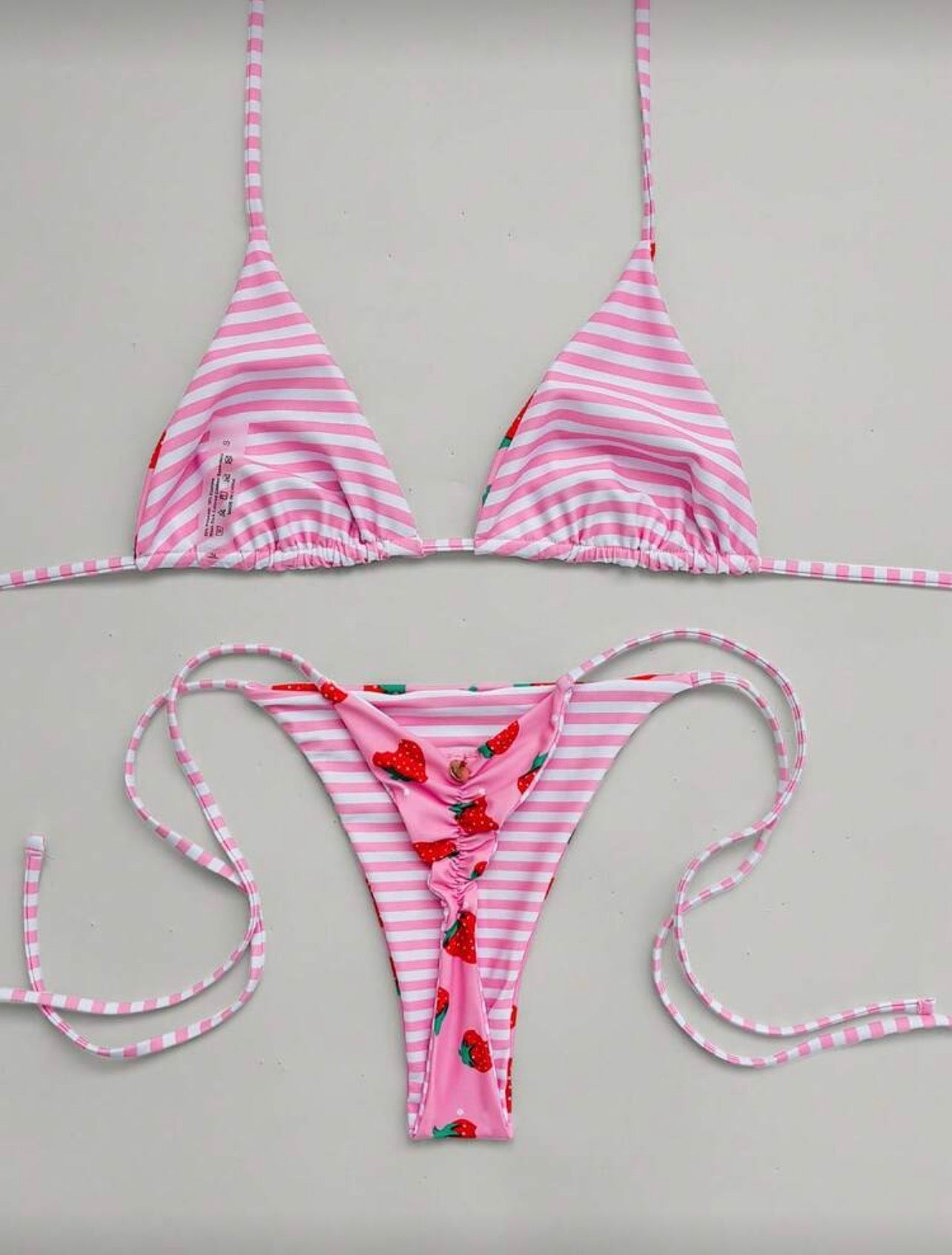 Women's Tie Bow Ruched Thong Bikini Set, Double-Sided Fruit Stripe Print Backless Design, 2026 Summer Holiday Pink Bikini Set