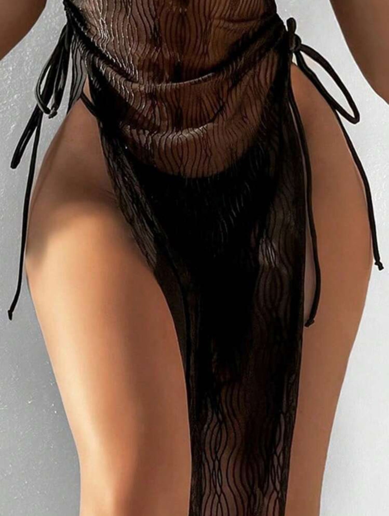 Swim SXY 3PCS Women Sling Halter Backless Top And Thong Panty Sexy Side Tie Ruffle Mesh Long Vest Spaghetti Strap Bikini Set