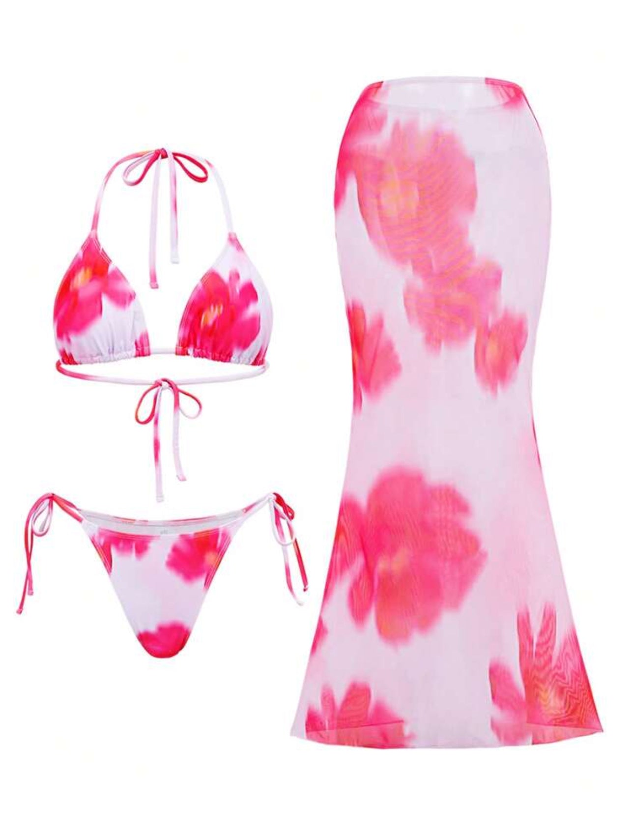Bonvoyette 3pcs Set Women Triangle Top With Printed Straps, Tie Sides Print Swim Bottoms, And Random Print Sheer Long Beach Dress Bikini Swimwear