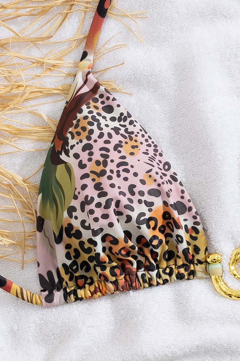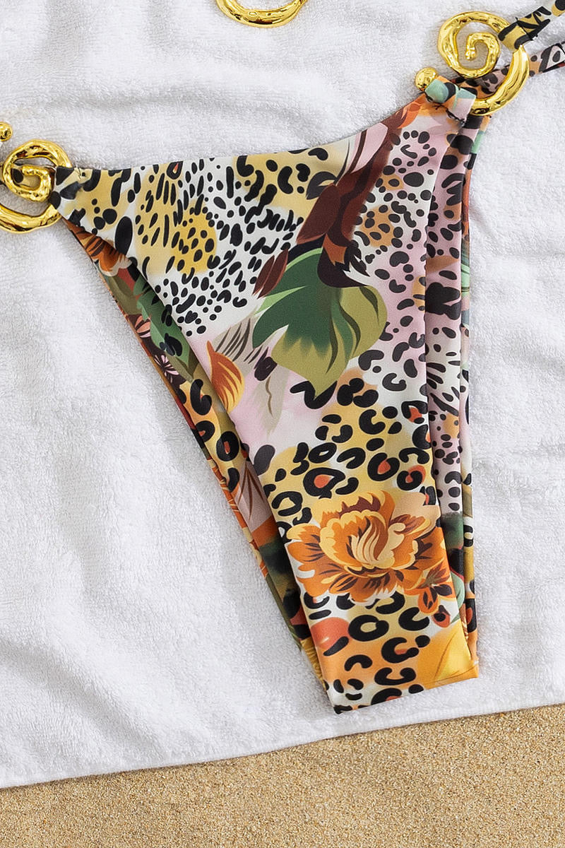Sexy leopard and flower print spiral ring linked padded halter-neck bikini set