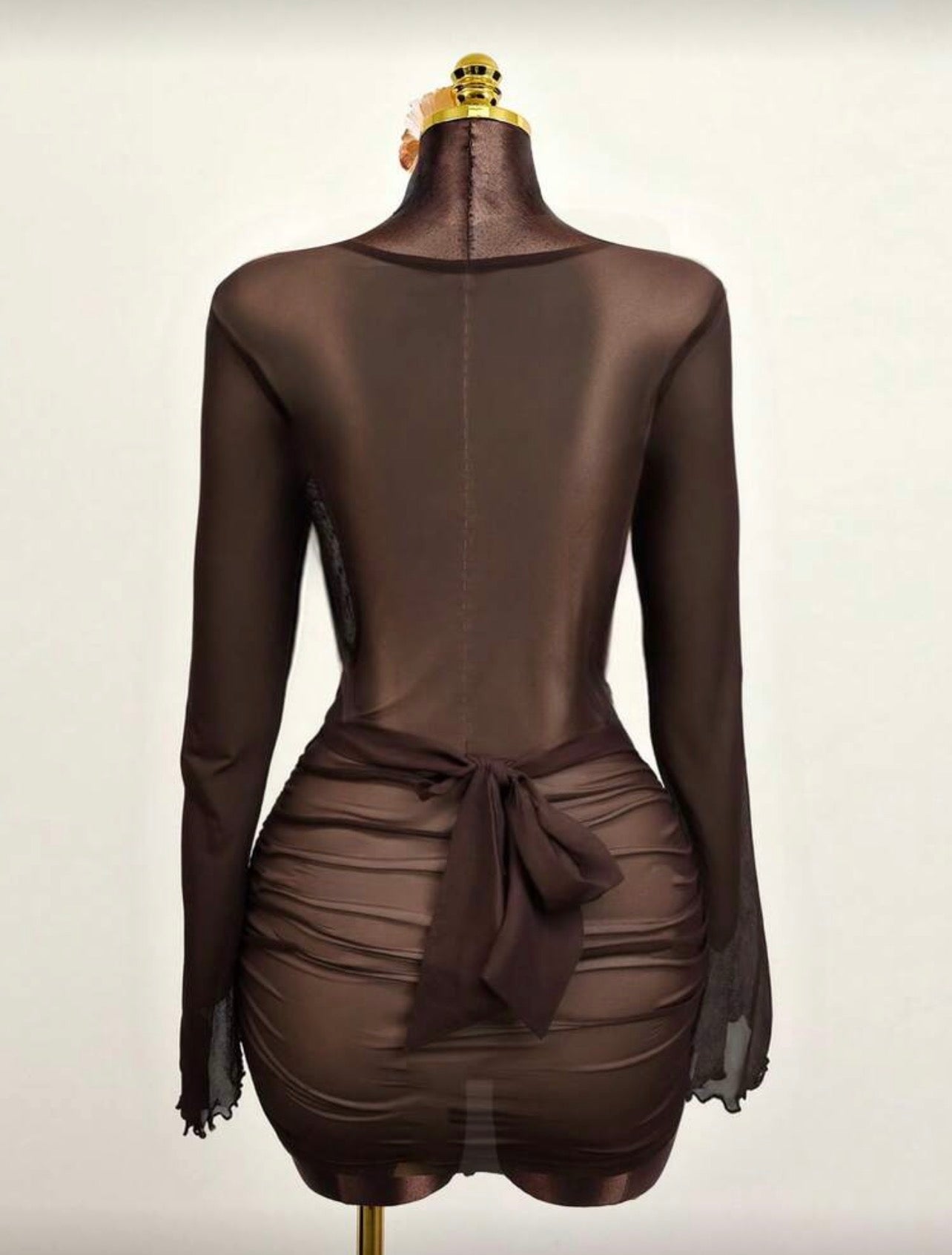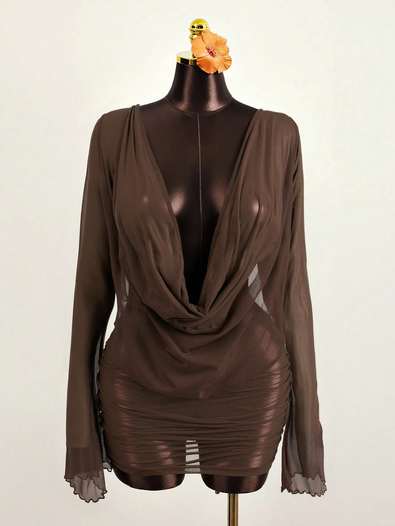 Women's Brown Draped Neck Flare Sleeve Tie Waist Ruffle Hem Wrap Dress, Elegant Sexy Casual For Spring Summer Holiday Beach Party