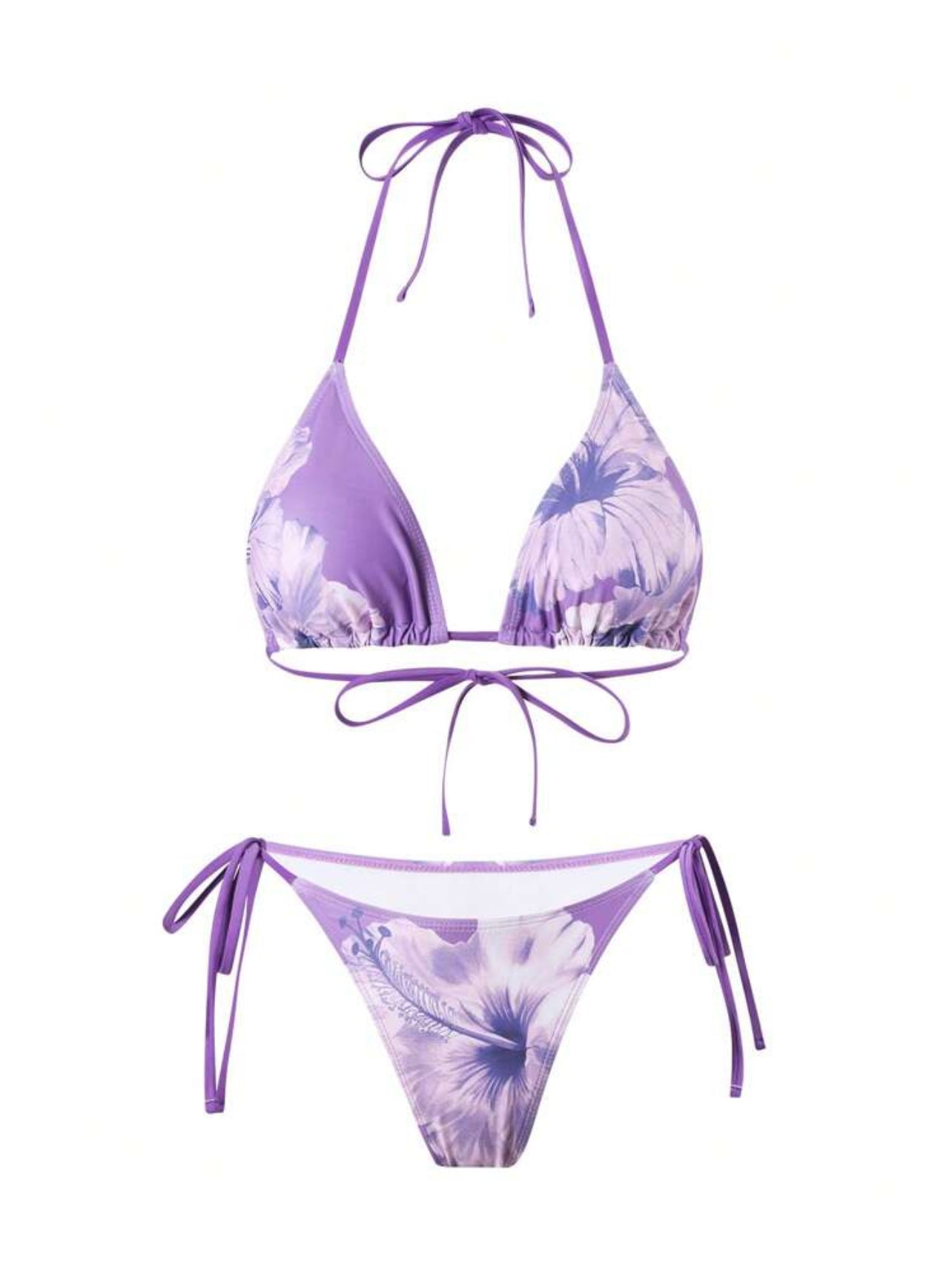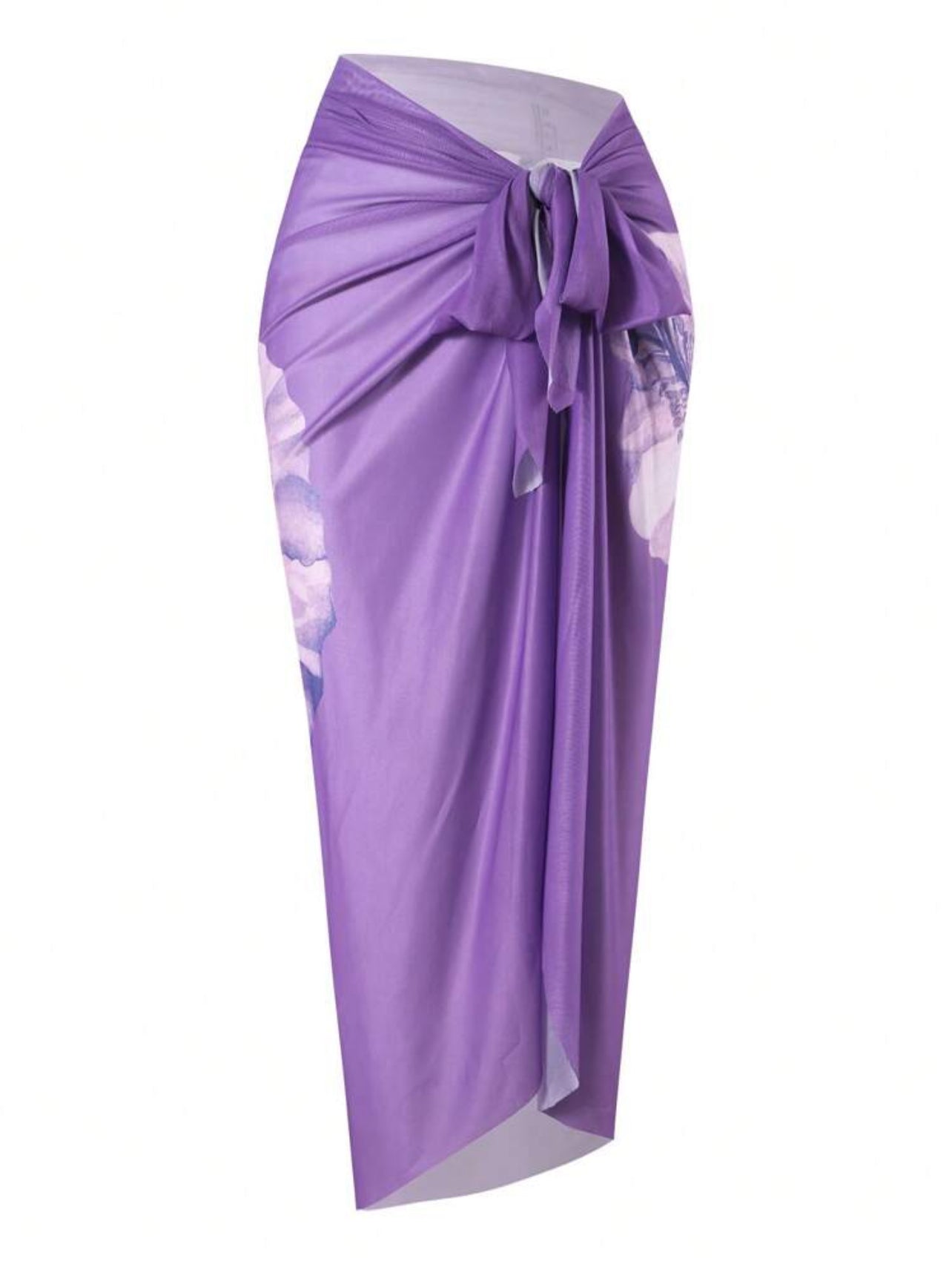 Swim 3pcs/Set Women Summer Beach Vacation Outfits, Floral Print Bikini Set And Mesh Tie-Front Beachwear Dress, Bohemian Holiday Style