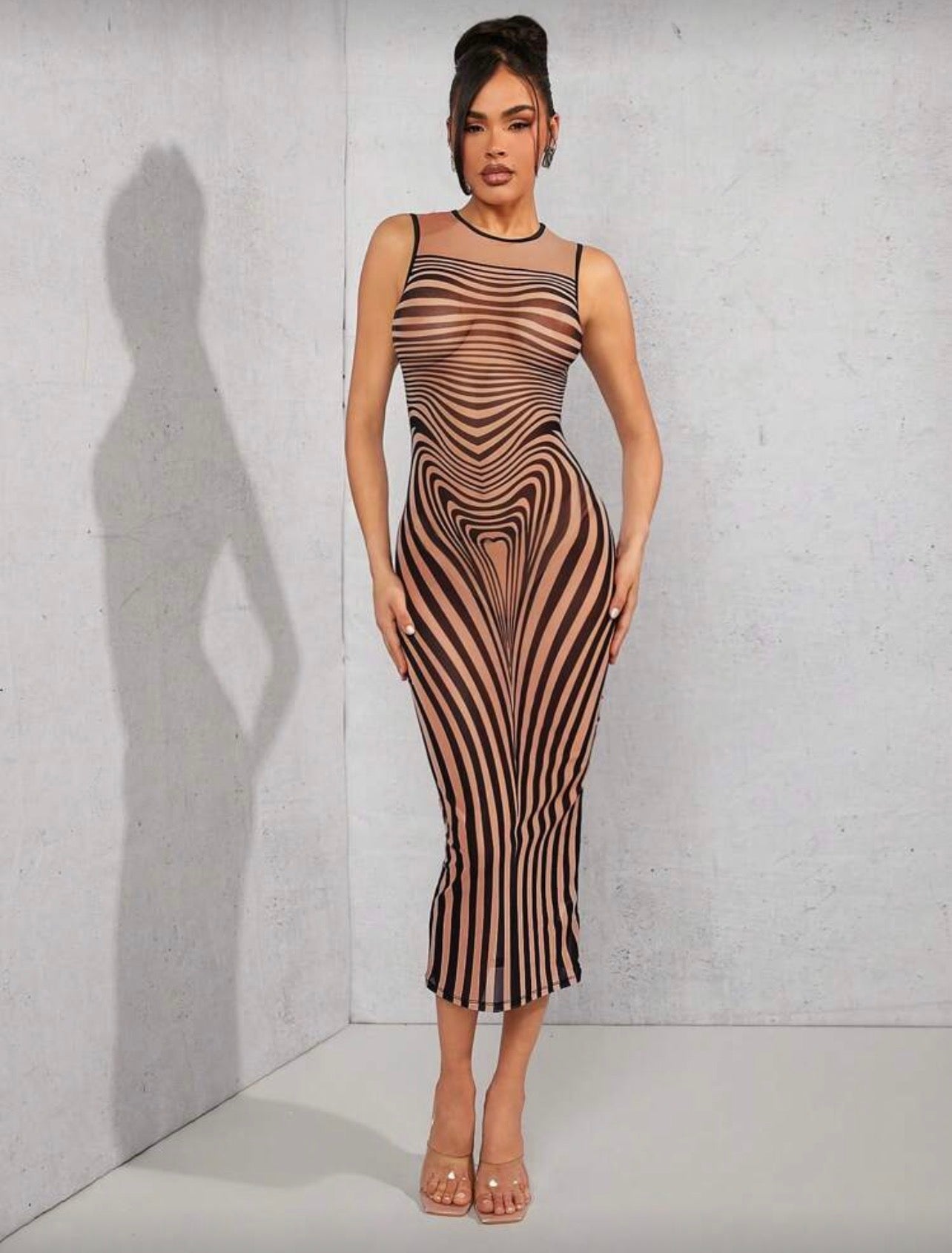 Hauture Striped Print Mesh Bodycon Dress, Minimalist And Fashionable, Suitable For Summer