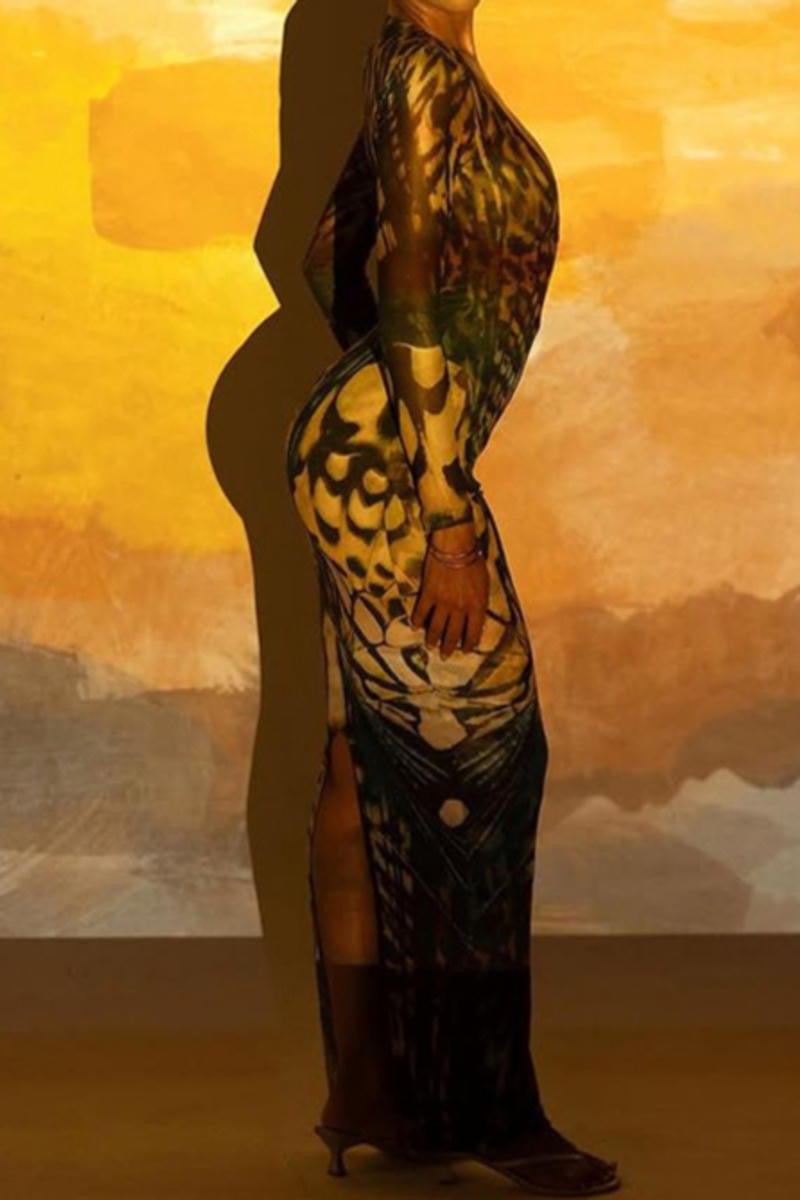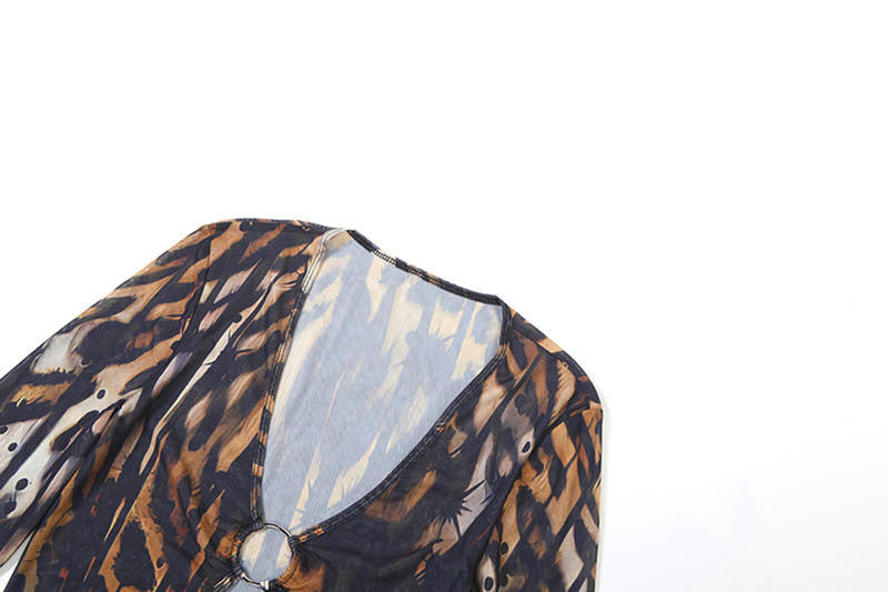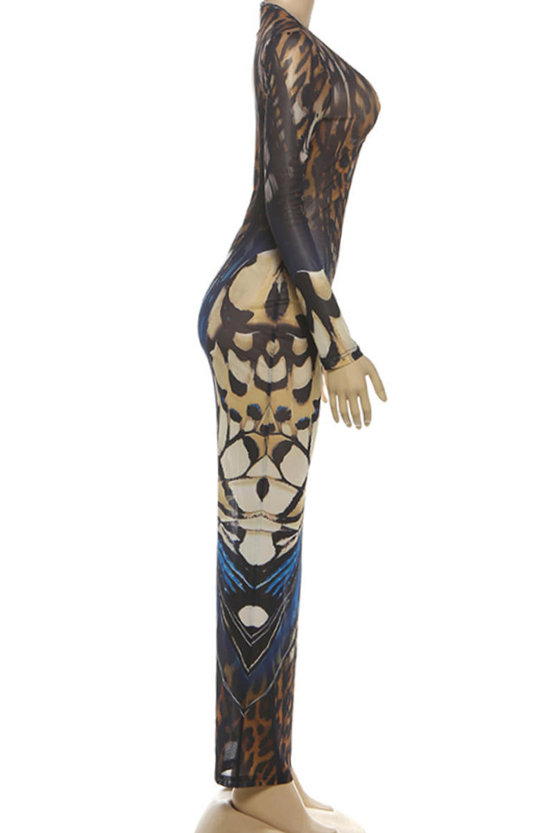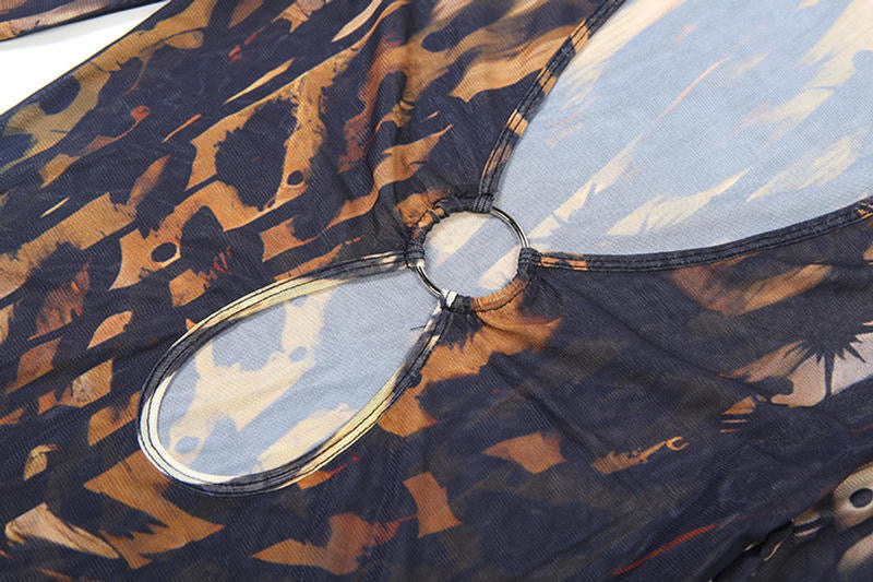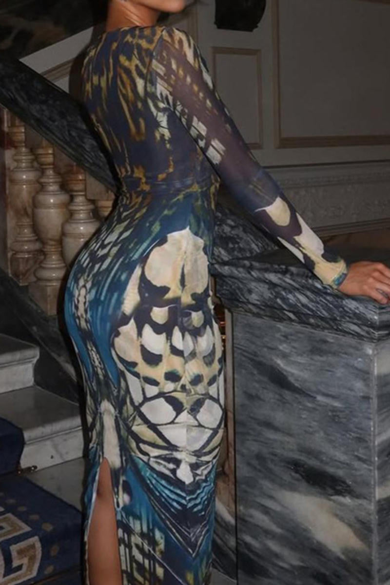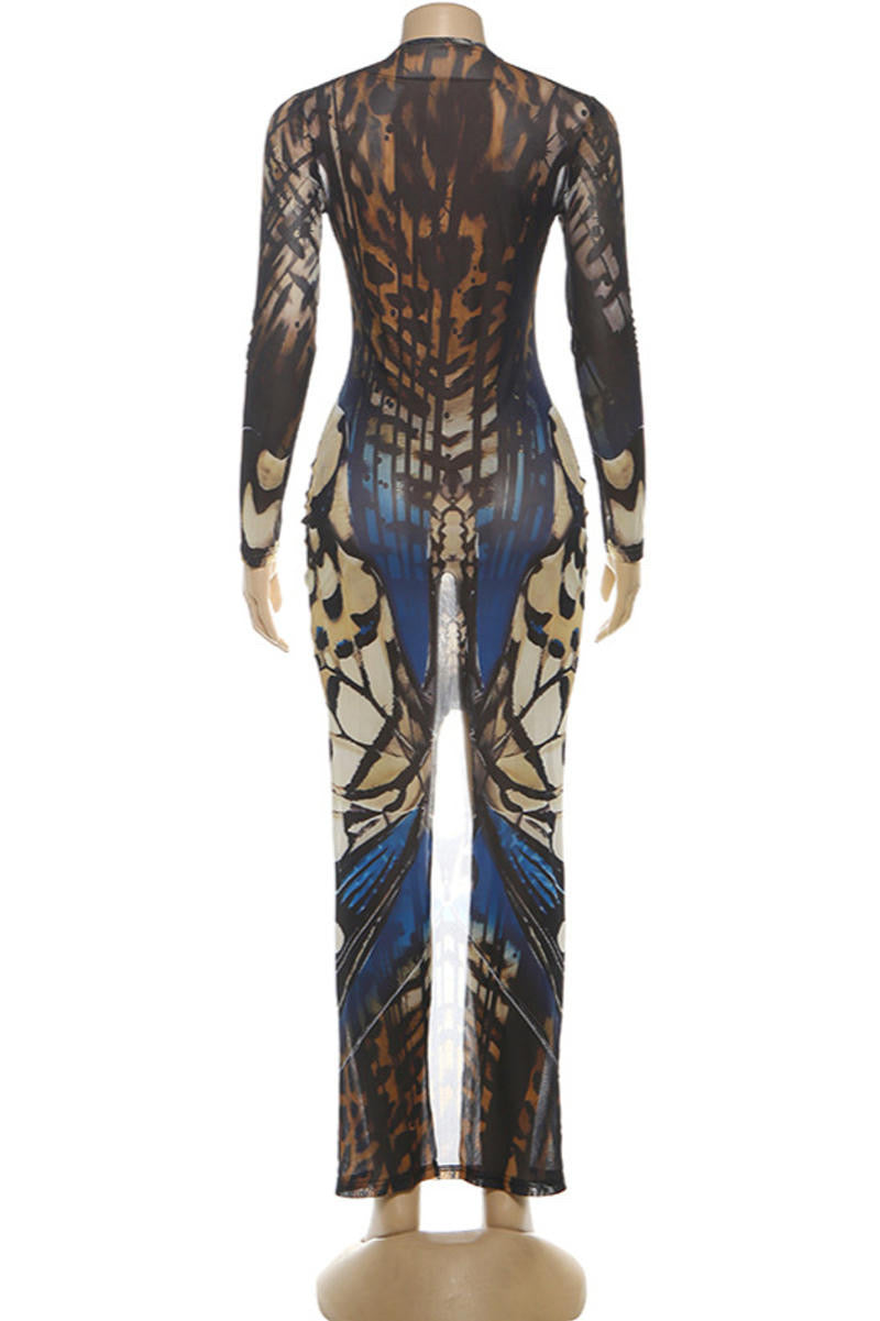 Sexy slight stretch deep Mesh v-neck batch printing maxi cover up dress