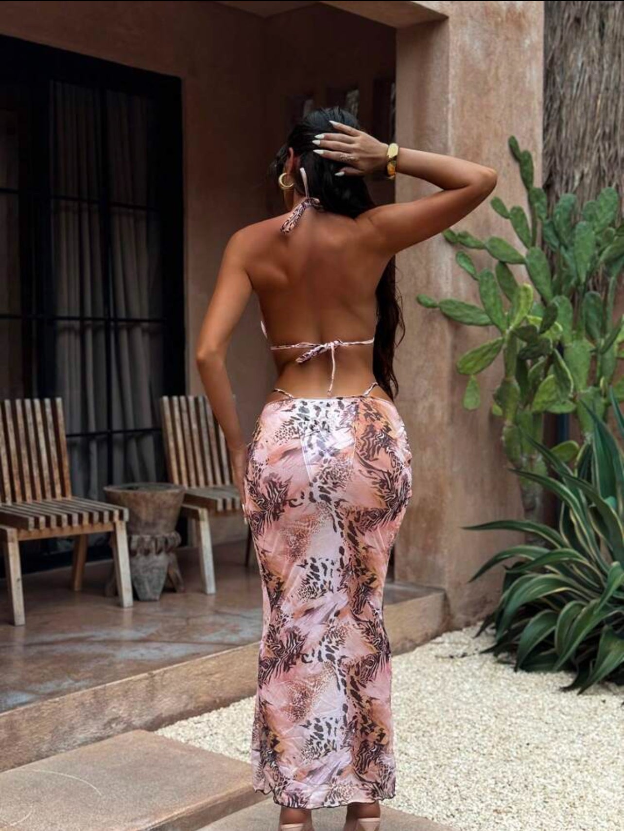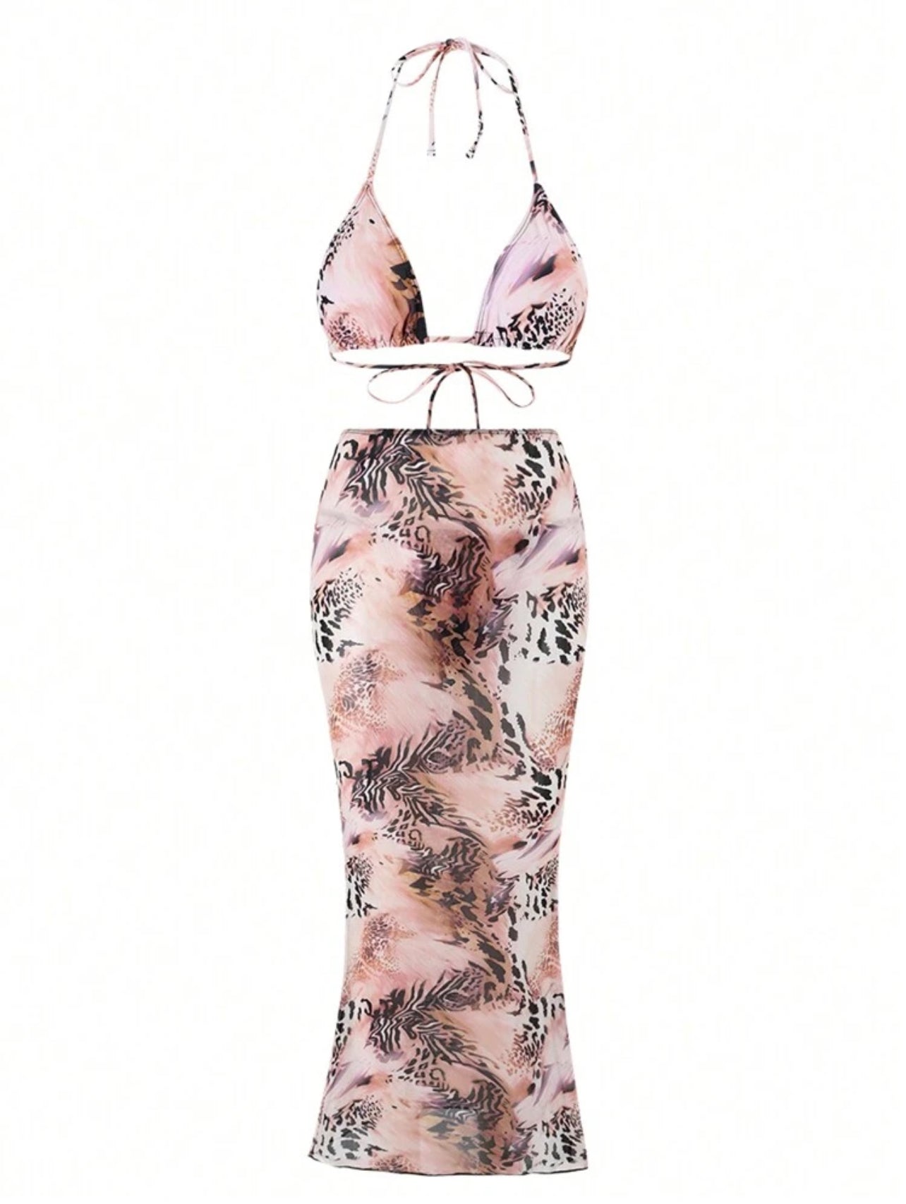 Swim SXY 3pcs/Set Women Beach Outfit, Random Print Triangle Neck Top & Bikini Bottom & Skirt, Vacation Beach Swimwear Set For Summer Beach Vacation