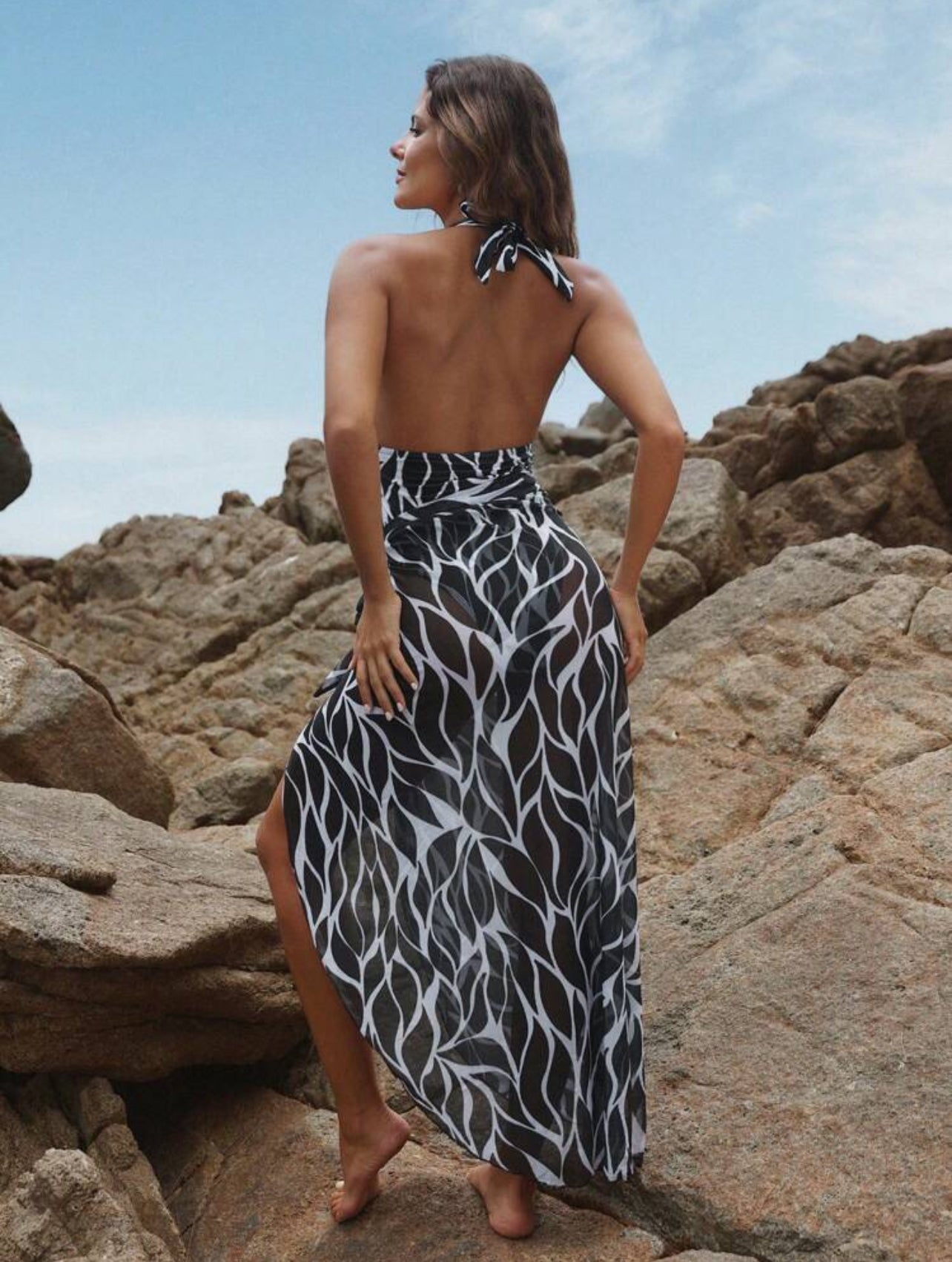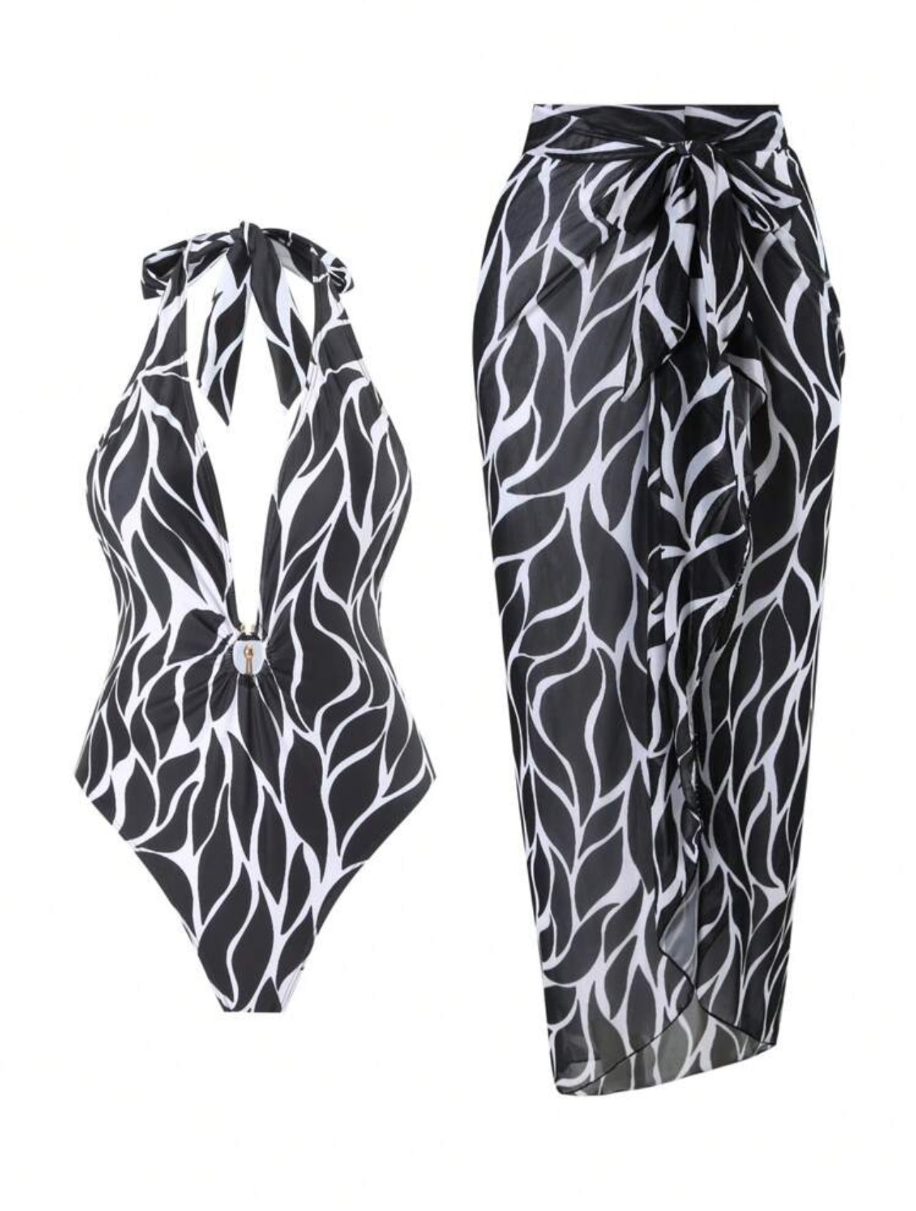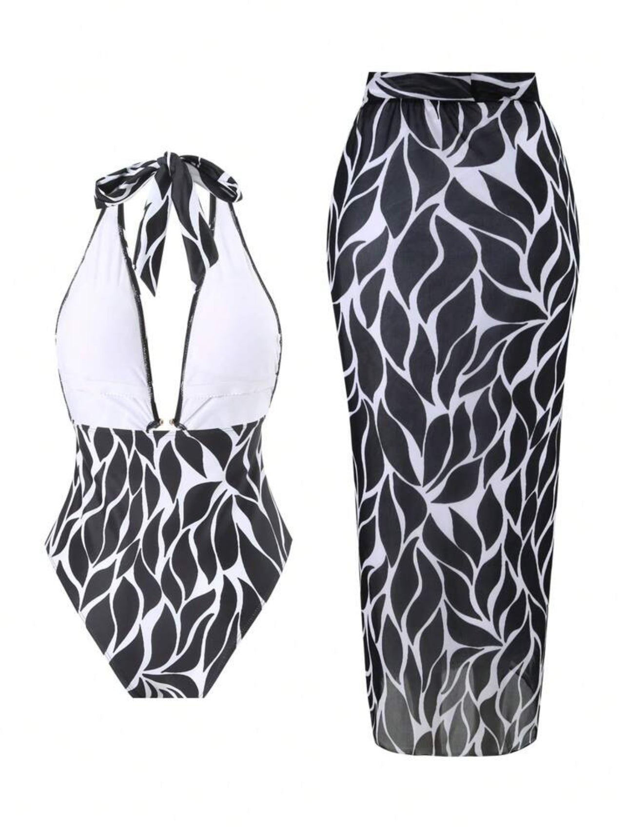 Swim 2pcs/Set Women High-End Printed Deep V-Neck Backless Tie-Waist Maxi Beach Dress & Swimsuit Set, Summer Vacation