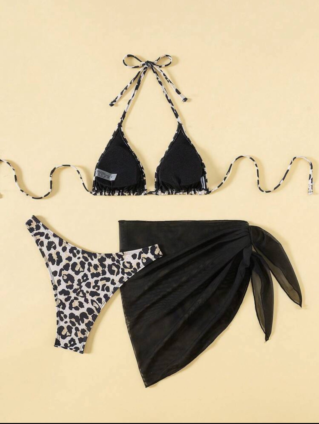 3pcs Women's Halter Triangle Bra And Side Tie Triangle Bikini Swimsuit Set