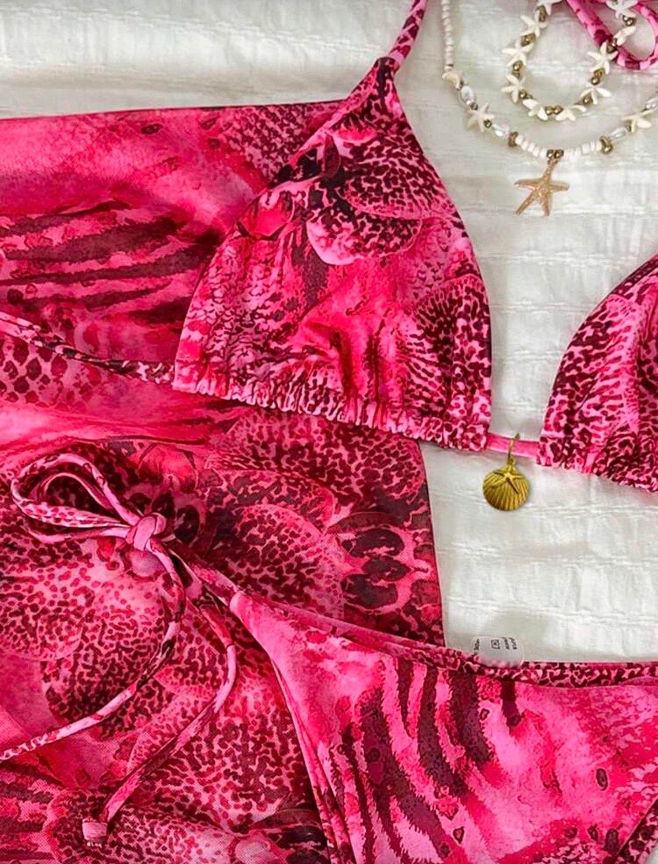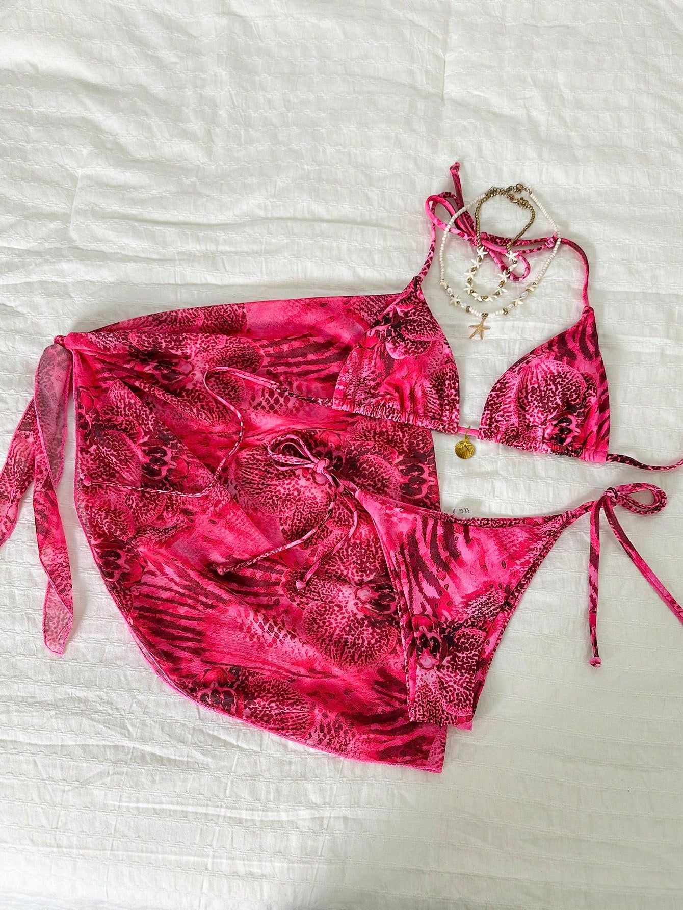 Random Print Halter Metal Decor 3pcs Set: Bikini Top, Bikini Bottom, And Mini Skirt, Spring/Summer